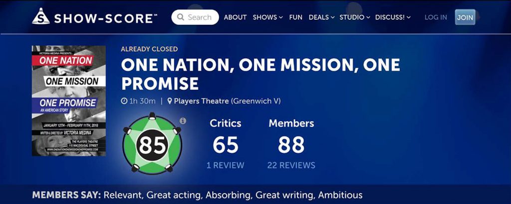 By the time the show closed you gave us a ShowScore rating of 85, which is so huge! We breathe life into the show to bring it to the stage, and you the audience give us the oxygen to keep the show going.